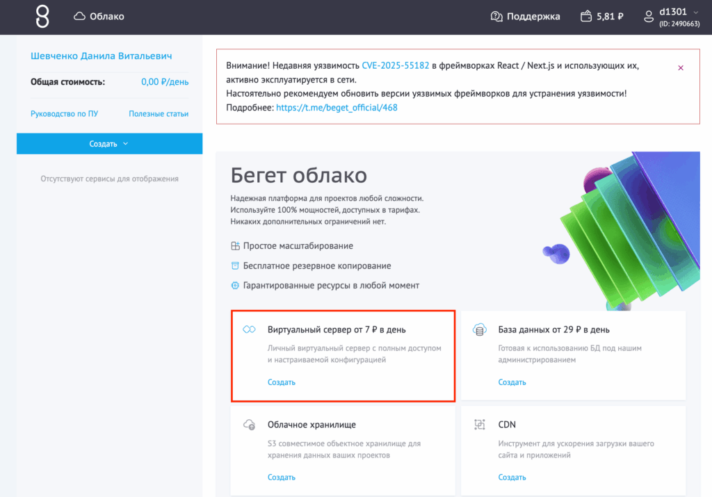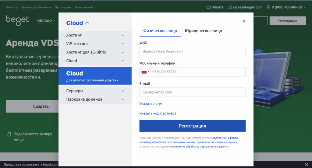 В качестве VPS мы выберем Beget, потому что на российском рынке он самый выгодный по соотношению цена–качество. И у него есть бесплатные автоматические копии сервера на случай, если у вашего сервера будут проблемы и данные на нем потеряются. Для покупки VPS переходим по ссылке: https://beget.com/p2490663/vps