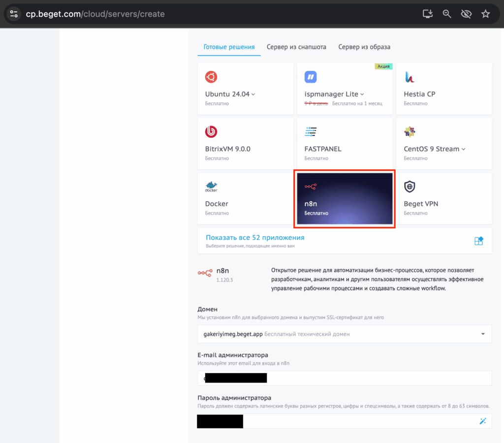 После нажимаем на кнопку “Создать виртуальный сервер”. Теперь сервер с установленным N8N готов к работе. Для начала работы с N8N вам нужно перейти по домену, который вы указали при создании облачного сервера на предыдущем этапе. Для входа используйте логин/email и пароль, которые вы указали при создании VPS, также они были отправлены на контактный email аккаунта и доступны в окне информации об установленном приложении в панели управления виртуальным сервером.